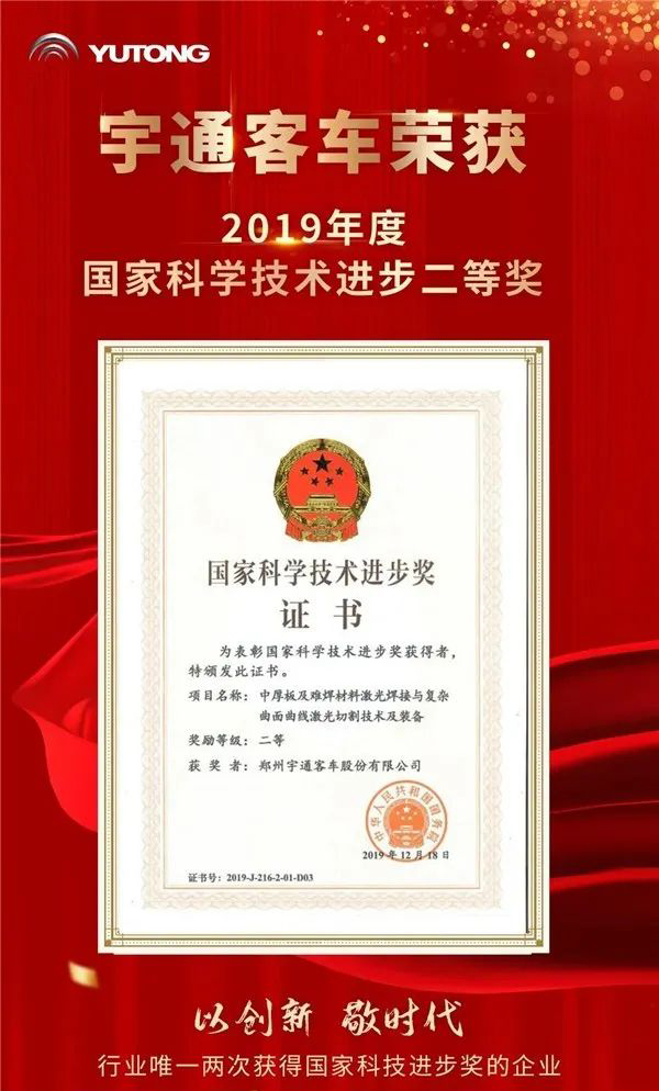 日前,国务院正式颁发2019年国家科学技术进步奖证书,郑州宇通客车股份有限公司《中厚板及难焊材料激光焊接与复杂曲面曲线激光切割技术及装备》项目荣获国家科技进步奖二等奖。