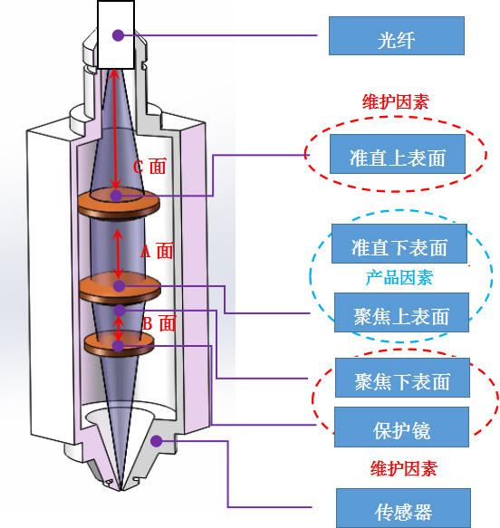 聚焦镜上表面与准直镜下表面(A面)污染:在镜片质保期内,第一次出现可能是腔内有污染导致,应足够重视,建议与产品负责人沟通并尽量一次性解决;长期使用出现污染,应注意腔内是否清洁到位,镜片维护是否正确,建议在千级以上洁净工作台检查清洁。