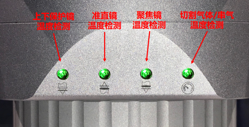 在切割头的核心关键部位,嵌入了相应的精密传感器,实时监控切割头核心区域工作状态,并通过切割头上的的四个三色(红绿黄)LED灯以3种闪烁状态(常亮、闪烁、快速闪烁)实时显示。可有效规避因其他异常导致对切割头元器件近一步损伤,使异常可视化,让干预提前介入,从而降低损失。同时,通过收集监控数据,可为产品进一步优化提供参考。