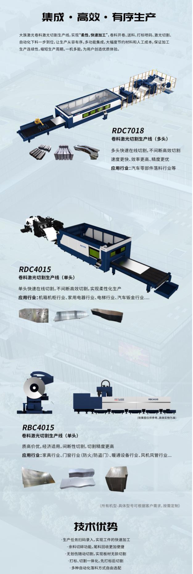 江南平台智能装备集团卷料激光切割生产线,实现“柔性、快速加工”,卷料开卷、送料、打标喷码、激光切割、自动化下料一步到位,让生产从容有序。多功能集成,大幅度节约材料和人工成本,保证加工生产连续性,缩短生产周期。一机多能,为用户创造优质体验。