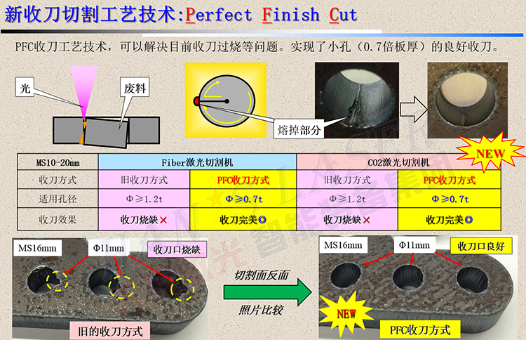 碳钢厚板切割时,在收刀处经常出现过熔现象,严重影响工件品质,对精密要求高的客户来说决不容许的。PFC收刀工艺技术,可以解决目前收刀过烧等问题。实现了小孔(0.7倍板厚)的良好收刀。