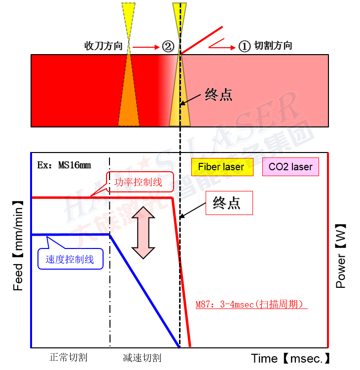 原因是切割部分发生的热会比切割速度更快地向前传达,比光束先行的热在到收刀口附近,由于热传导的关系,收刀口处的热没地方扩散,处于高温状态。这时辅助气体氧气的供给会使收刀口激烈燃烧以致烧缺。