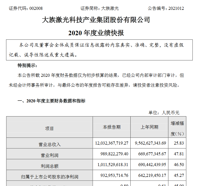 2020年1-12月营业总收入为 12,032,367,719.27元,比上年同期增长25.83%;归属于上市公司股东的净利润为 932,953,714.76元,比上年同期增长45.27%。
