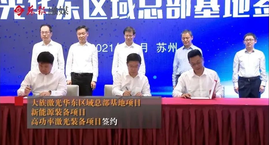大族控股集团有限公司副总裁张永龙、安春泽,江南平台副总裁黄祥虎,江南平台极限制造及行业专机事业群智能切割总经理胡瑞,江南平台投资总监岳明;苏州市委常委、秘书长潘国强,张家港市委书记韩卫,张家港市委副书记、代市长蔡剑锋,张家港市委常委、保税区党工委副书记、管委会副主任陆崇珉,张家港保税区管委会副主任顾卫彬,以及苏州市和张家港市有关部门主要负责同志共同参加签约活动。