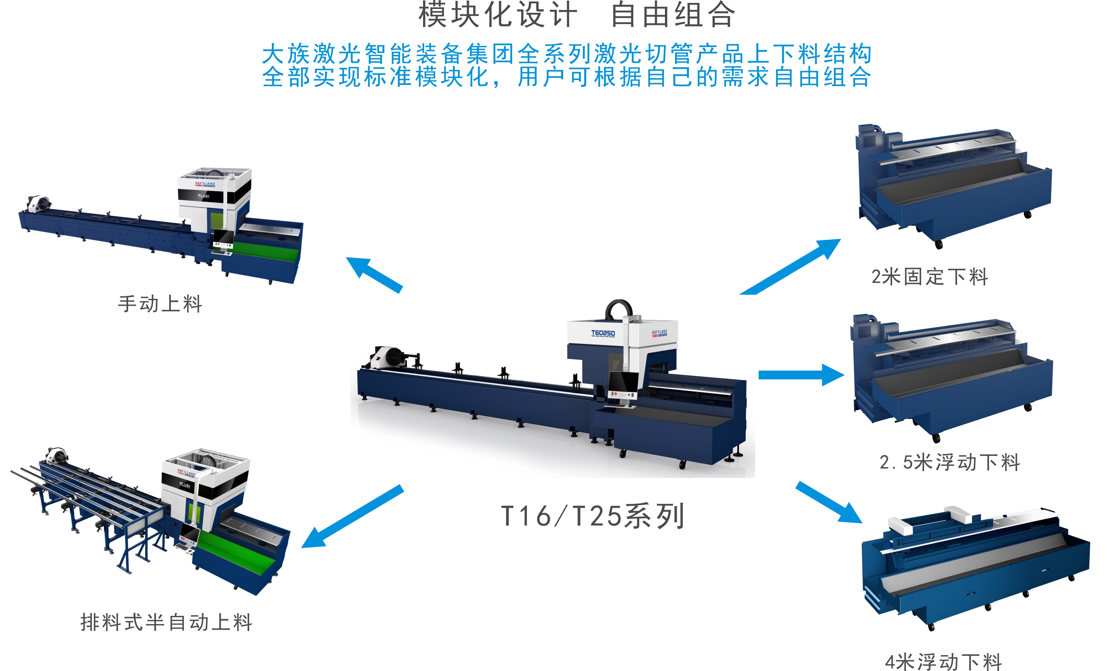 采用模块化设计,用户不仅可选配不同的上料方式——手动上料、排料式半自动上料。而且还可选配不同的下料方式——2m固定式下料、2.5m浮动式下料、4m浮动式下料。用户可根据自身实际的需求,进行自由组合,满足用户需求。并且可扩展槽钢、角钢、工字钢等型材切割功能,轻松应对不同挑战。