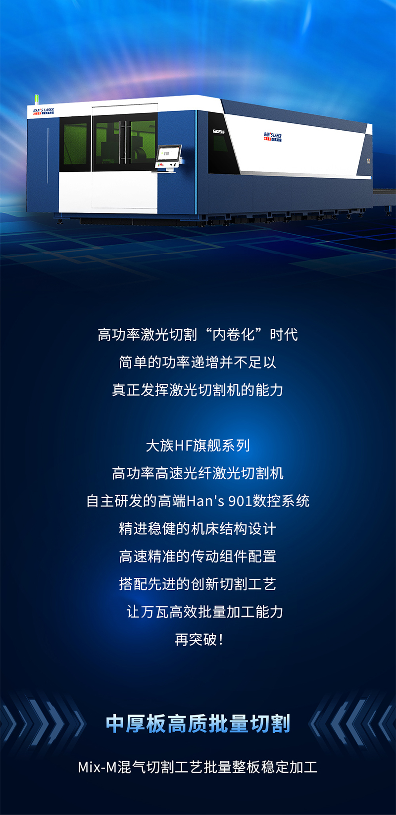 HF系列光纤激光切割机最大程度地发挥数千瓦乃至上万瓦光纤激光器的切割速度,为您提供最高效的薄、中、厚板加工解决方案。