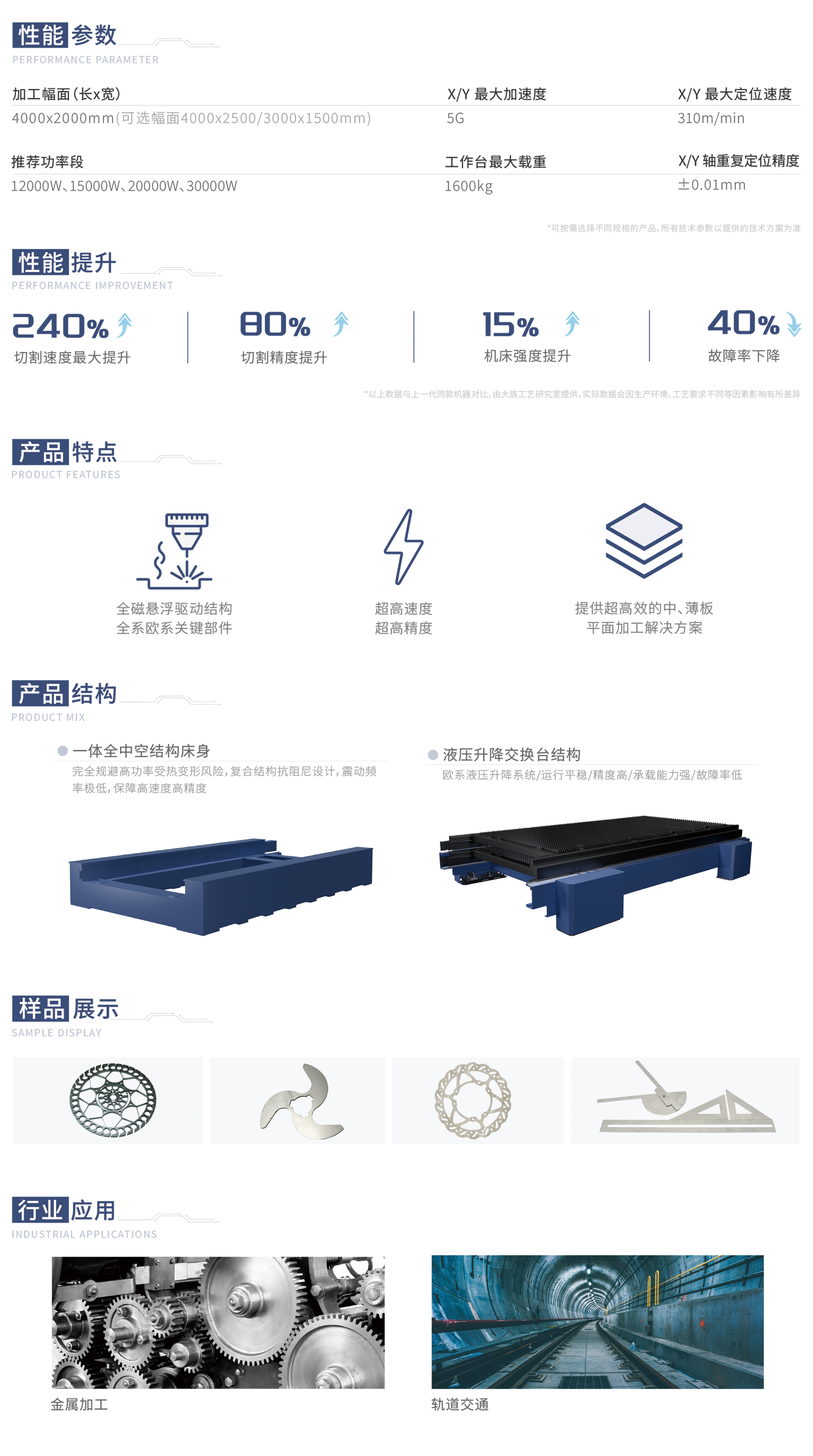 HF系列光纤激光切割机最大程度地发挥数千瓦乃至上万瓦光纤激光器的切割速度,为您提供最高效的薄、中、厚板加工解决方案。