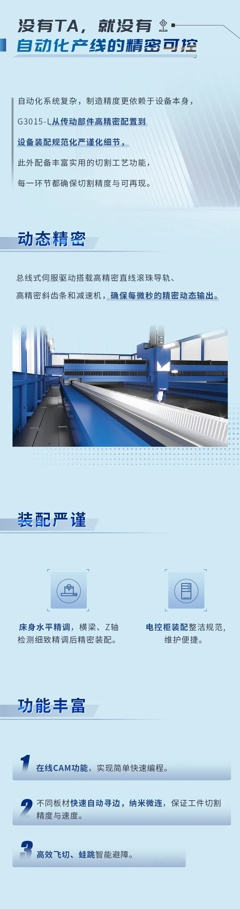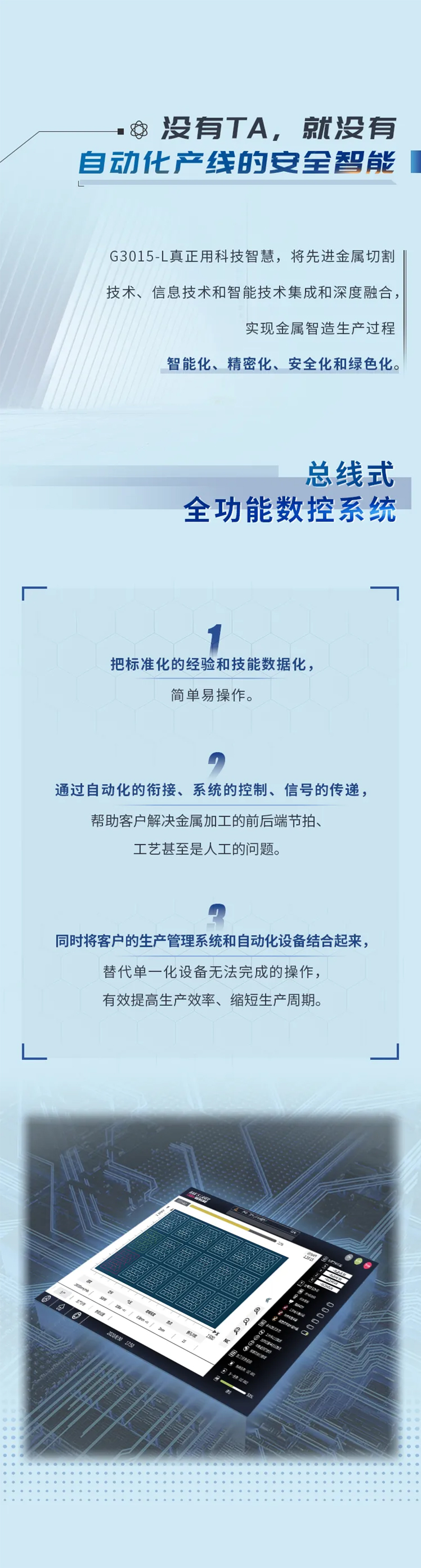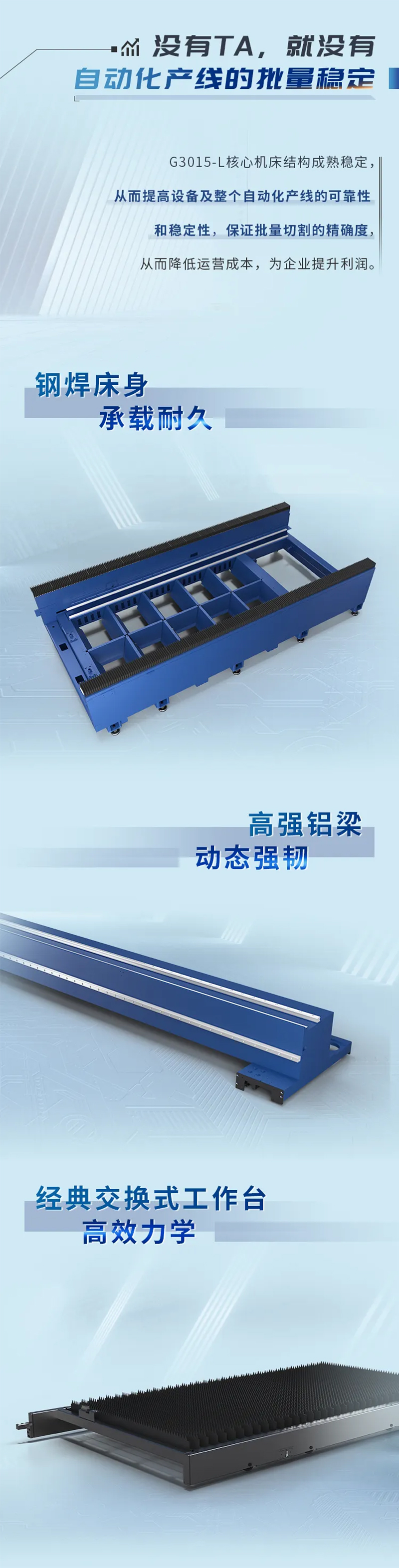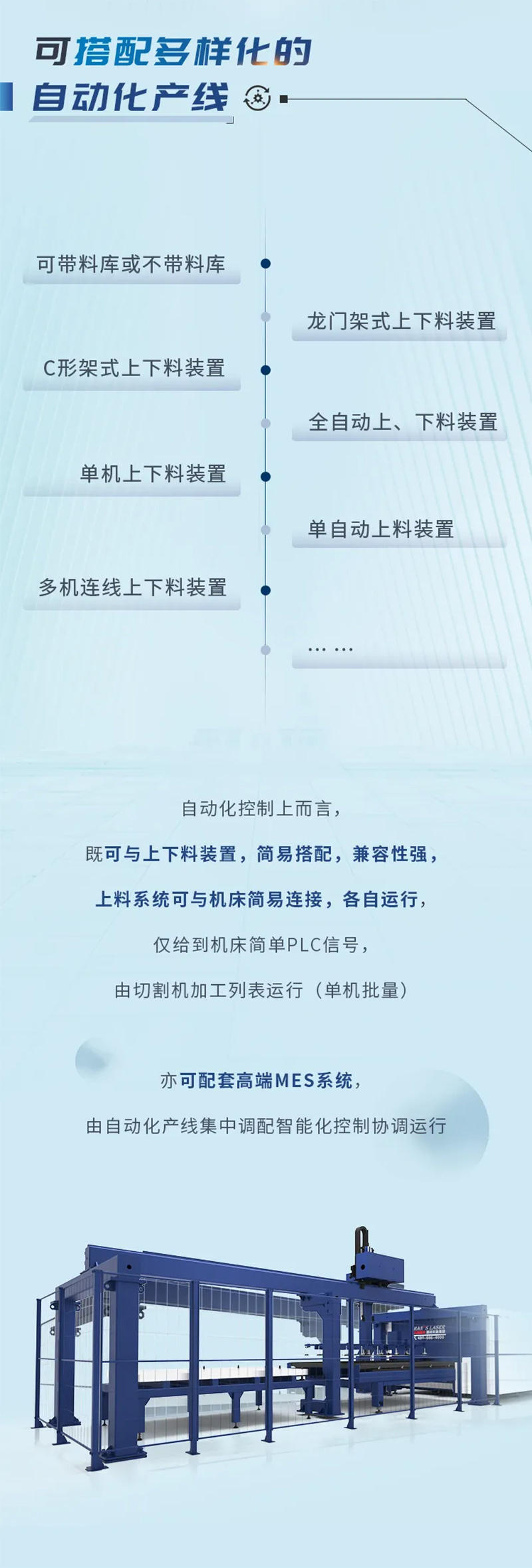 全新结构的ALU系列自动化切割生产线,协调性更高、效率更高,模块化设计,可根据需求自由组合,预留扩展接口,可根据后续实际产能情况增加机器,实现1拖N,并可预留信息化接口,对接MES,为后续并入智能化数字车间做好基础。